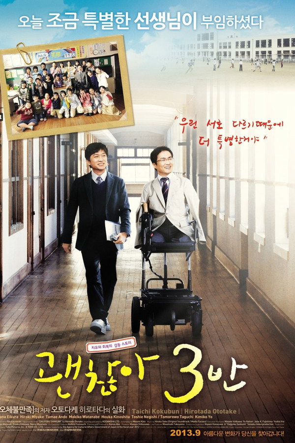 "Daijobu 3 Kumi" depicts the interactions between new teacher Shinnosuke Akao, who was born without arms and legs, and the 28 students in his 5th grade class, told from the vantage point of school board member Yusaku Shiraishi